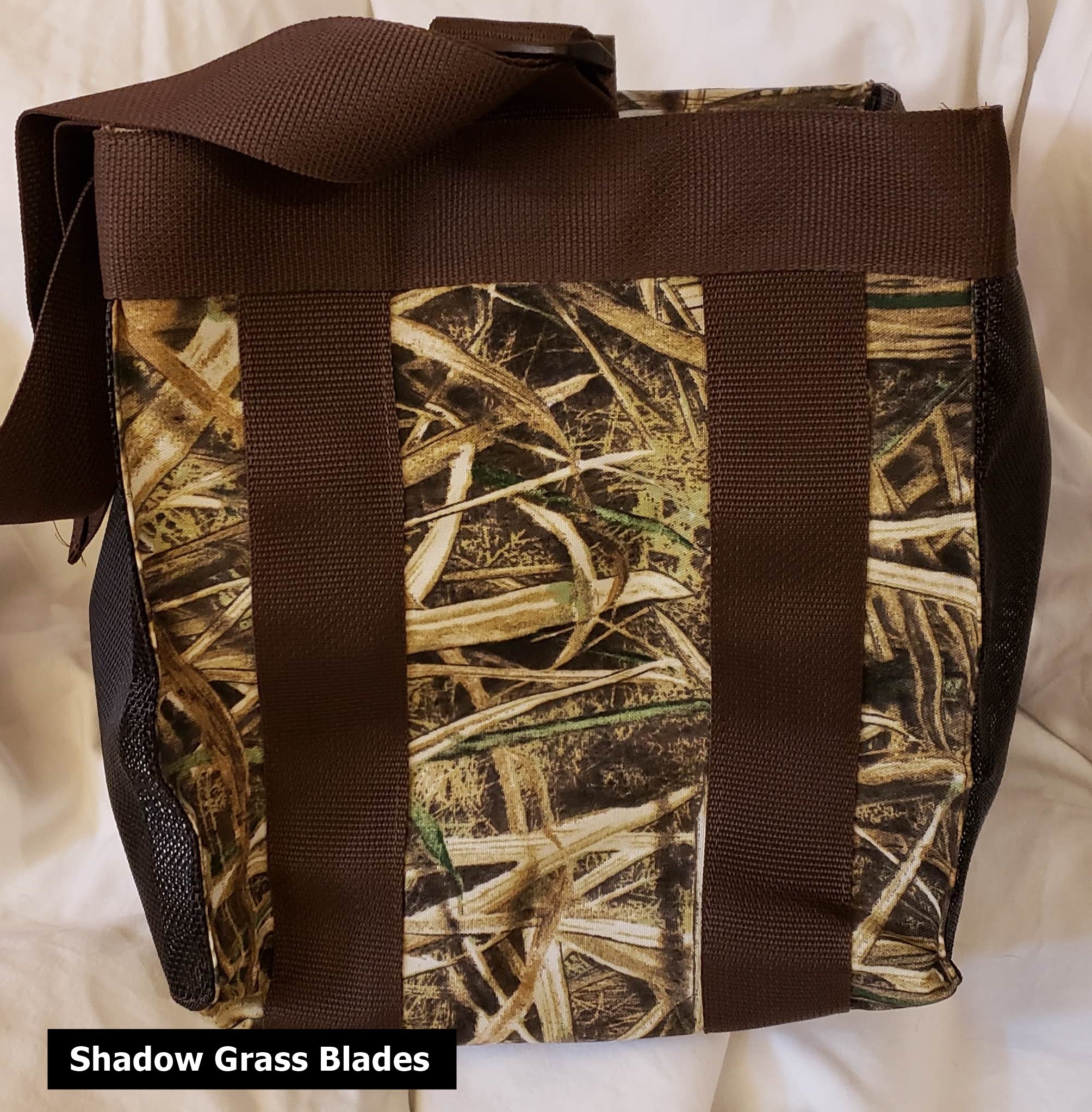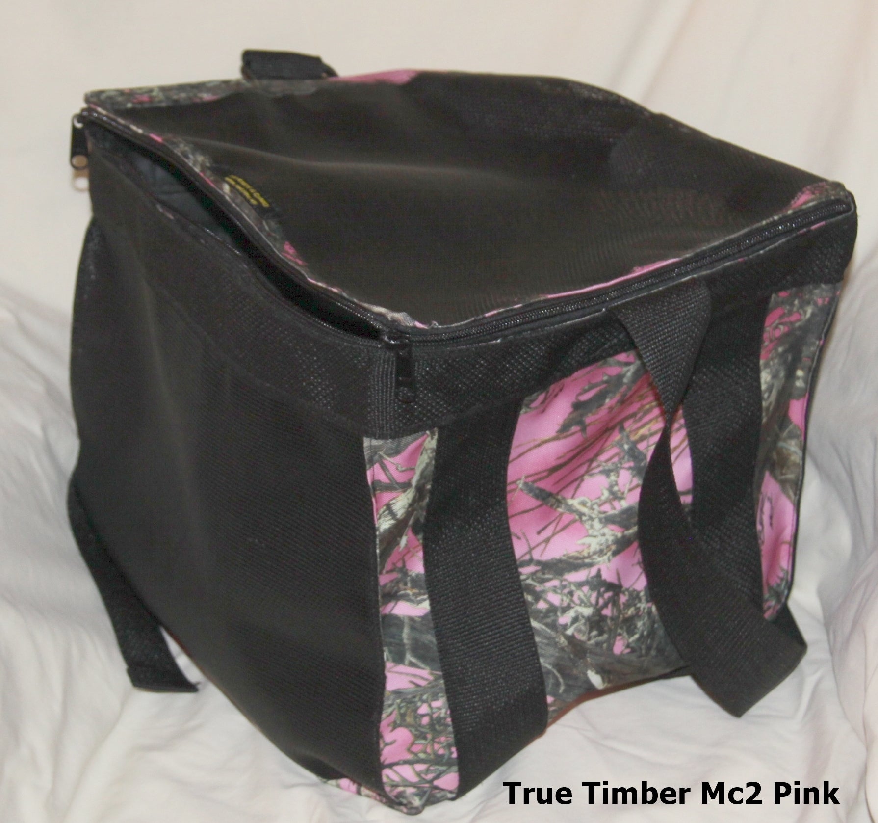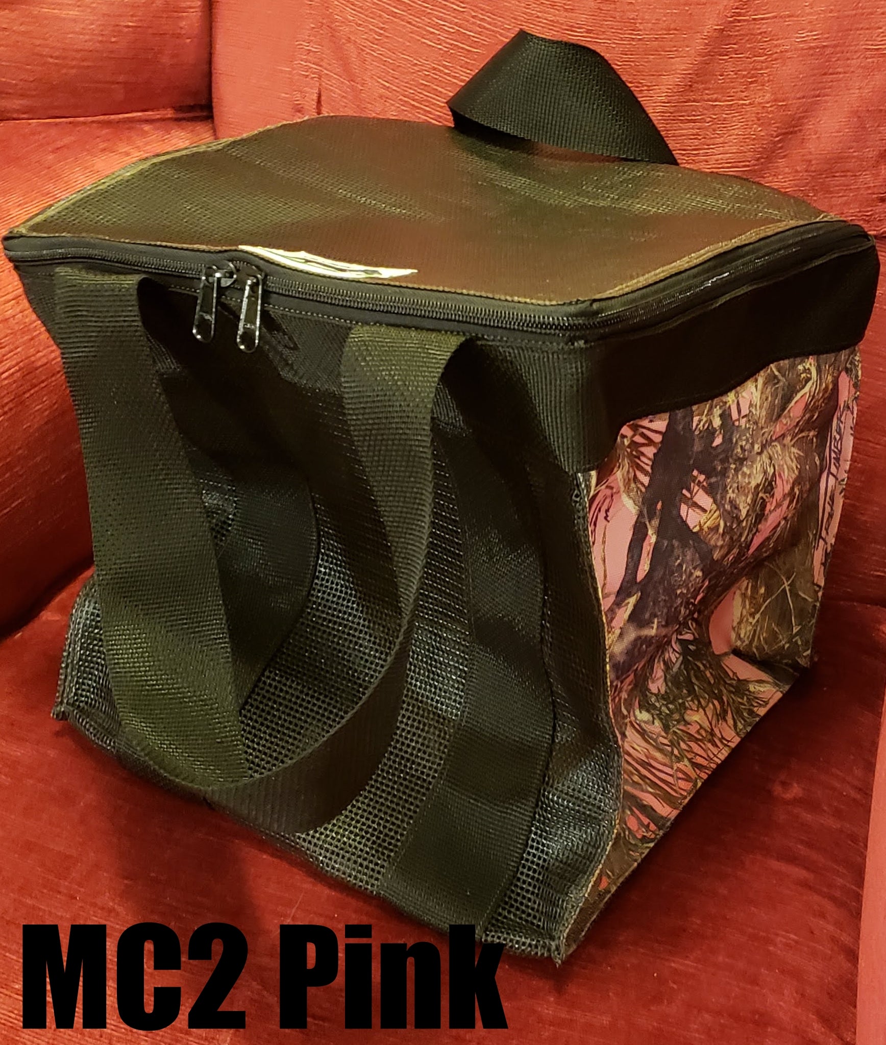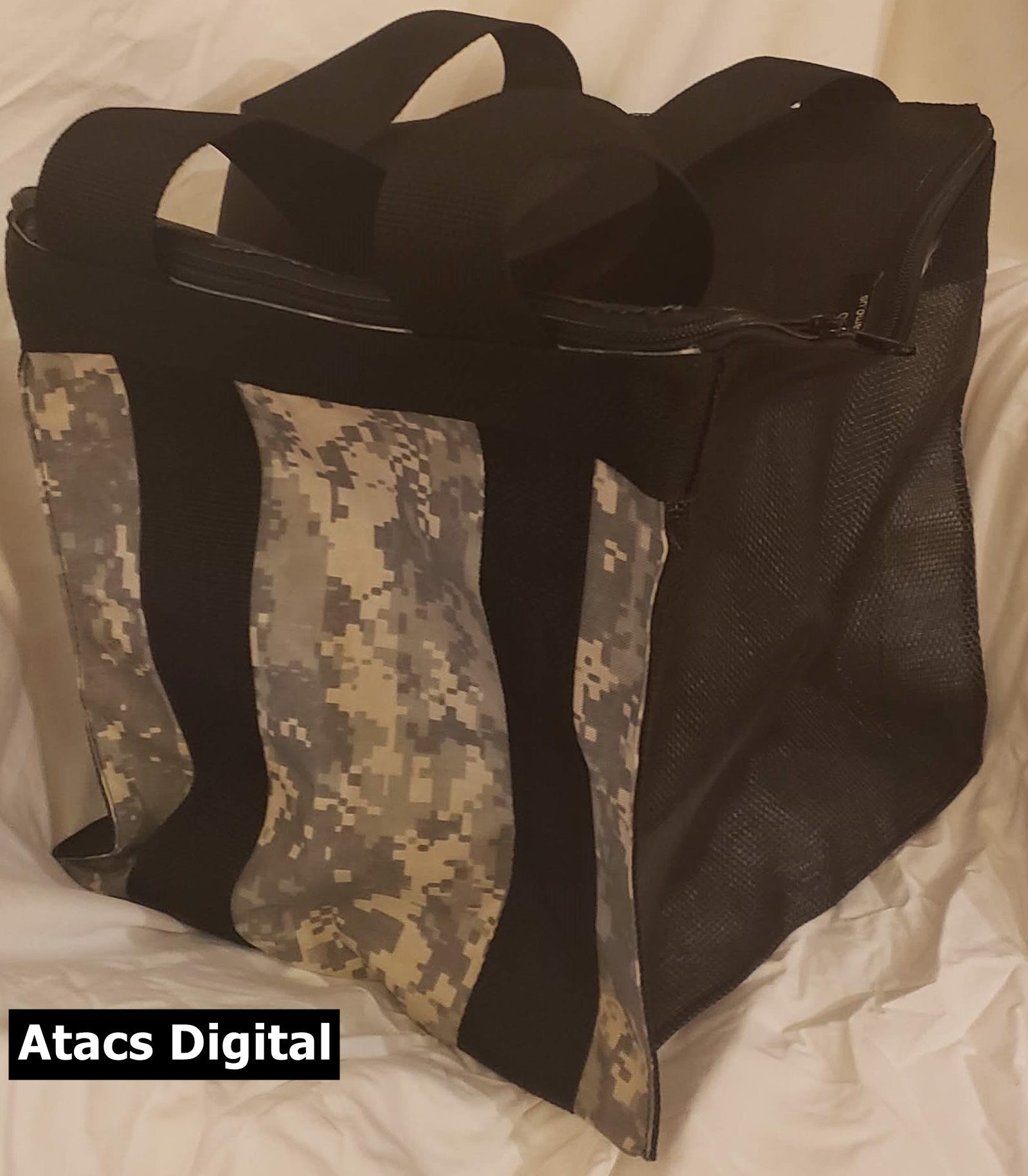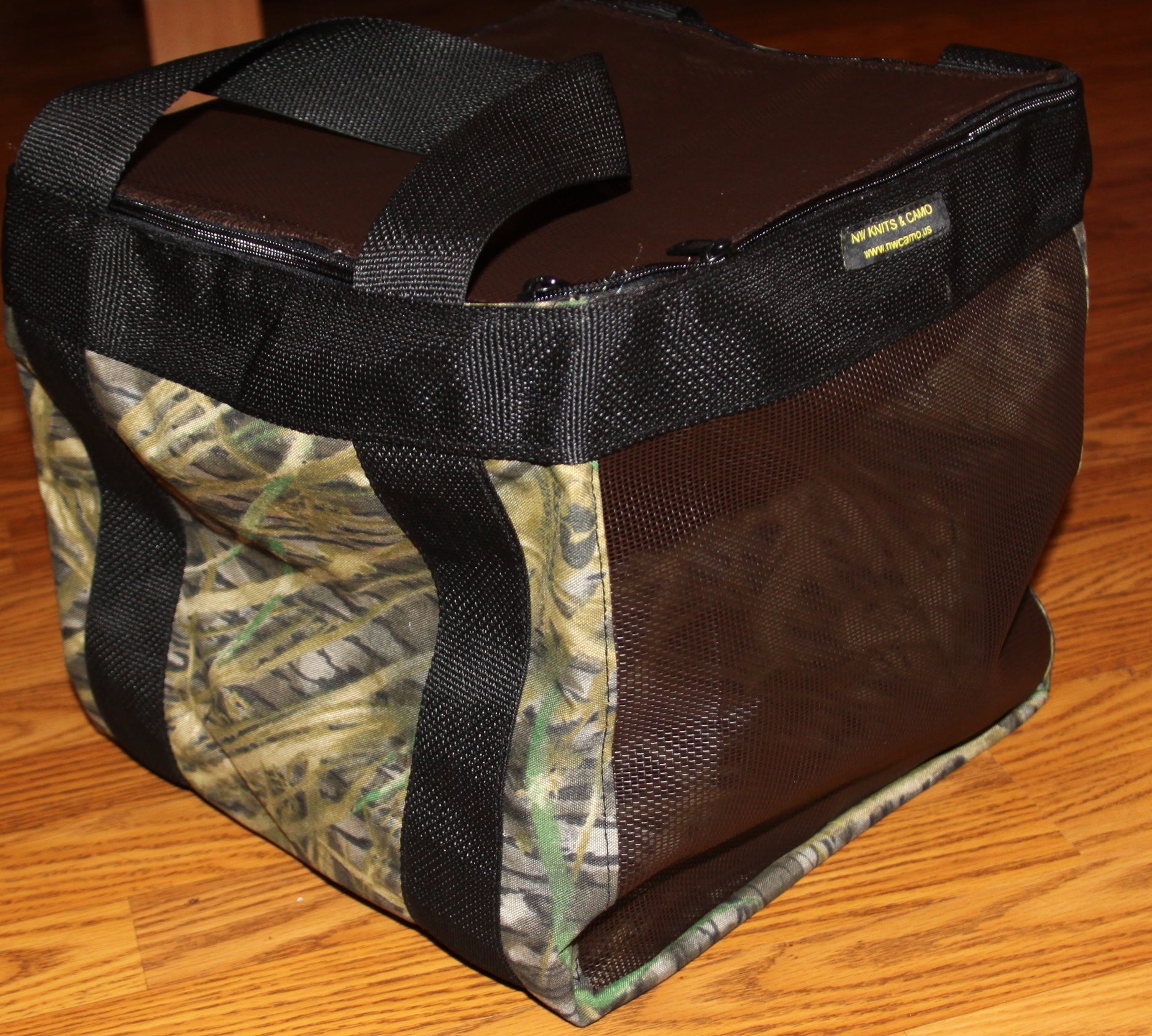 This large camo bag measures about 12 x 12 x 12 featuring a zippered top. It is made with a coated nylon mesh with a durable cordura fabric on 2 sides. The carry straps go around the bottom of the bag to give support when the bag is full. The zippered top features a two-way zipper for easy access. A perfect bag for whatever you need to carry and keep secure. The bag comes with hand straps or an adjustable shoulder strap.