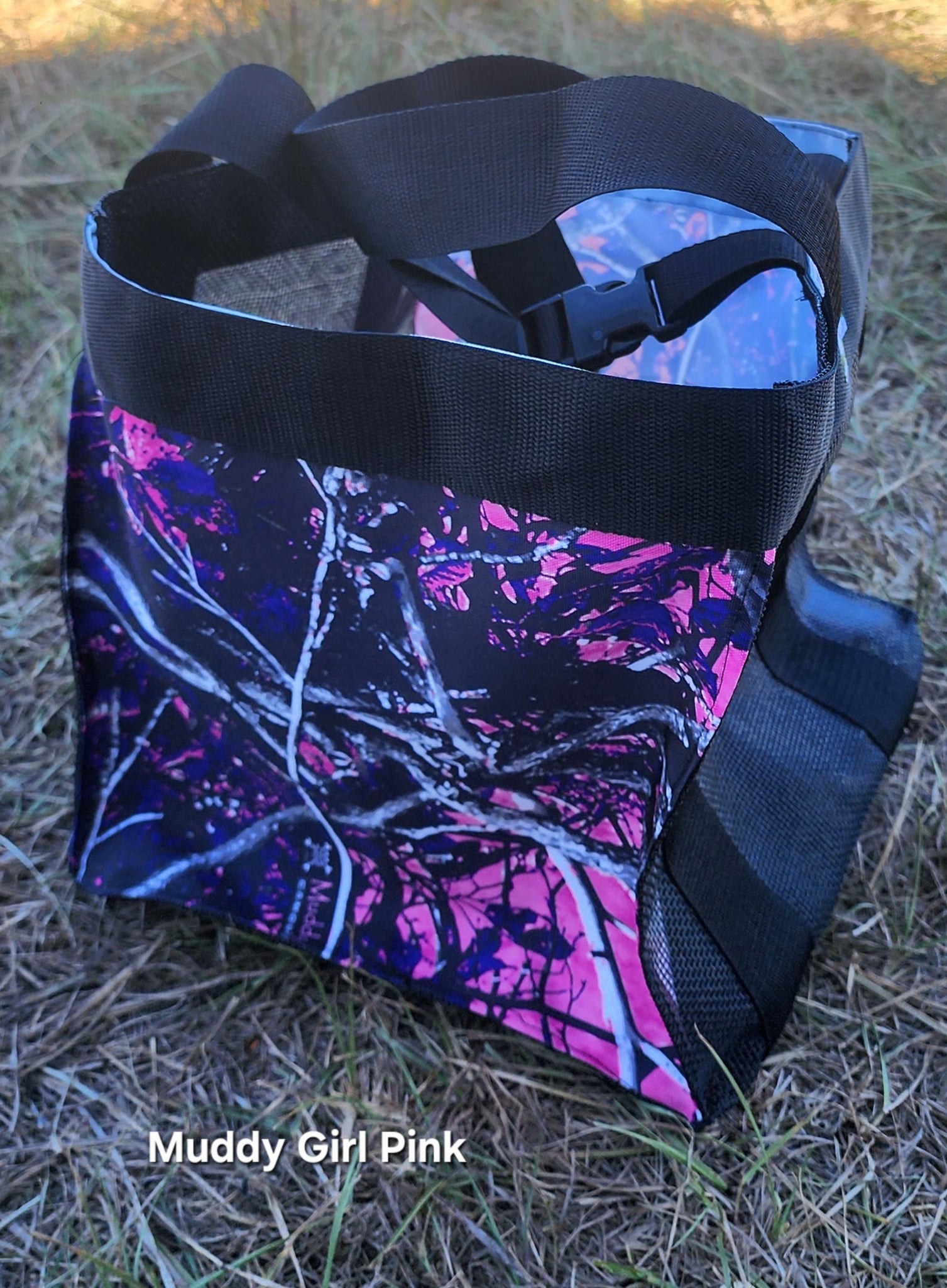 These large bumper bags/tote bags are made using a coated nylon mesh fabric with cordura camo fabric on 2 sides. The bag measures about 12 inches x 12 inches x 12 inches. It will hold 30 standard 2" diameter dog training bumpers.