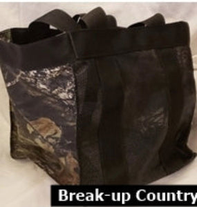 These large bumper bags/tote bags are made from nylon mesh fabric on 2 sides and waterproof cordura fabric on the other 2 sides and bottom. The bag measures about 12 inches x 12 inches x 12 inches. It will hold 30 standard 2" diameter dog training bumpers.