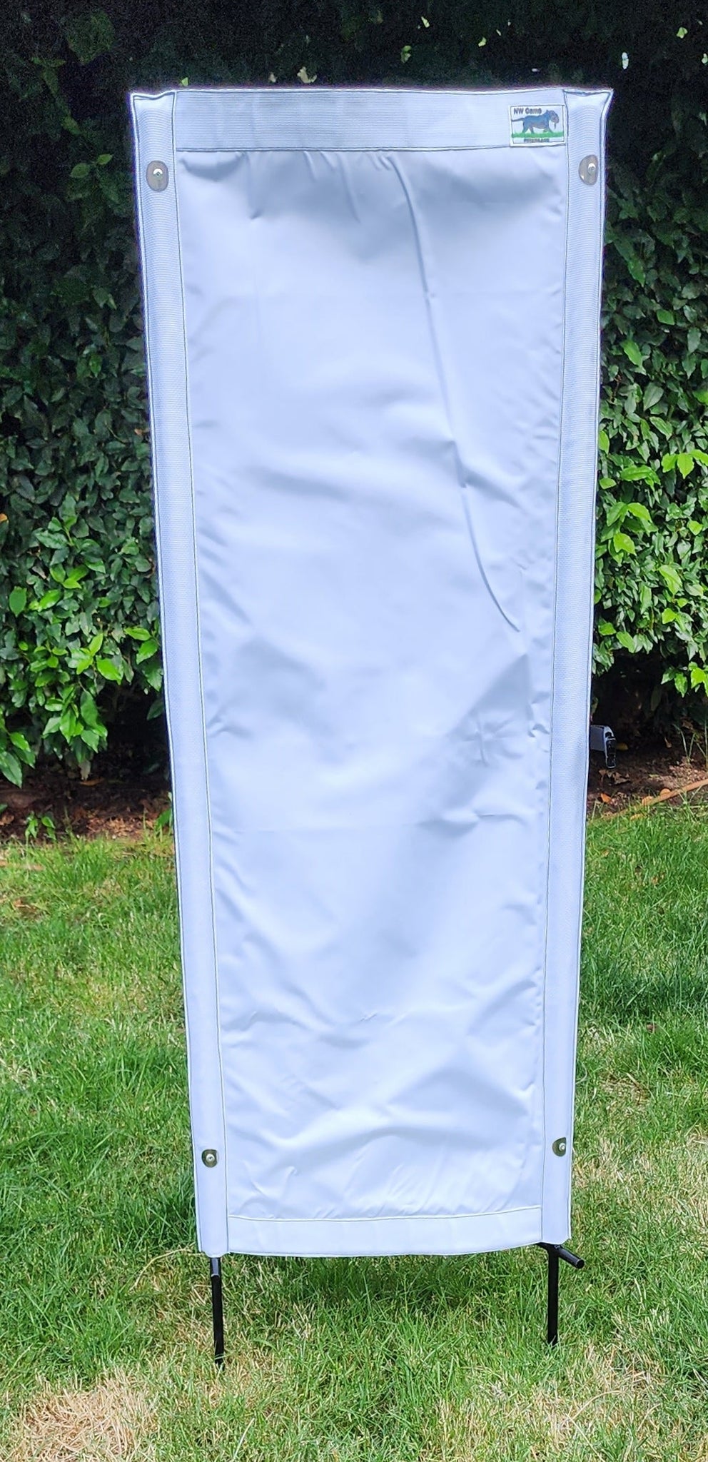Our NW Camo "Stickman” measures about 48" tall and 19" wide. It is made with black cordura on one side and a bright white cordura on the other side. The fabric is secured to our hybrid poles (aluminum shaft with a 10" steel step-in foot). It includes an attached strap with a quick release buckle to keep it secure when it is rolled up for storage and transport. When rolled up the black is on the outside to help keep the white side clean.